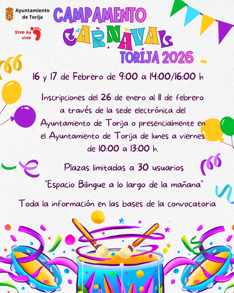 El Ayuntamiento de Torija ha abierto el plazo de inscripción para su Campamento Urbano de Carnaval 2026, que se desarrollará los días 16 y 17 de febrero. Este servicio, destinado a menores escolarizados desde el 2º ciclo de infantil hasta la ESO (hasta 16 años), tiene como objetivo ofrecer un espacio educativo y de ocio durante las vacaciones escolares, fomentando la autonomía, la socialización y el desarrollo saludable de los participantes. Las familias interesadas podrán formalizar las solicitudes desde hoy, 26 de enero hasta el 11 de febrero, de manera presencial en las oficinas municipales (de 10:00 a 13:00 horas) o a través de la sede electrónica del Ayuntamiento (https://torija.sedelectronica.es/).